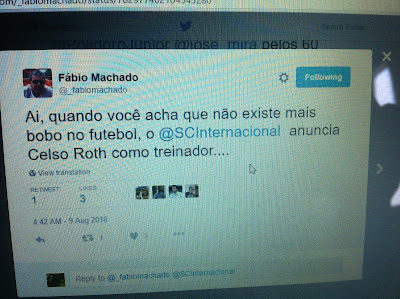 Não é porque os Jogos Olímpicos estão acontecendo que esqueçamos da nossa realidade atual, e o tweet do Fábio Machado resume mais do que qualquer coisa e só prova o quanto a trupe de Vitório Piffero está realmente fazendo força para que o Inter brigue para não cair e para que seu torcedor desperte uma revolta como já aconteceu no final dos anos 90 onde se não é o gol do Dunga o Inter caia ou até de 2002 que o falecido Librelato salvou a vida colorada jogando no Mangueirão.